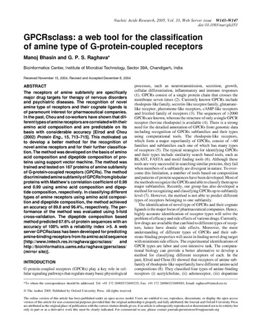 Bhasin, Manoj and Raghava, G.P.S. (2005) GPCRsclass: a web tool for the classification of amine type of G-protein-coupled receptors. Nucleic acids research, 33 (Web Se). W143-7. ISSN 1362-4962