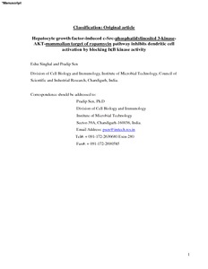 Singhal, Eshu and Sen, Pradip (2011) Hepatocyte growth factor-induced c-Src-phosphatidylinositol 3-kinase-AKT-mammalian target of rapamycin pathway inhibits dendritic cell activation by blocking IκB kinase activity. The international journal of biochemistry & cell biology, 43 (8). pp. 1134-46. ISSN 1878-5875