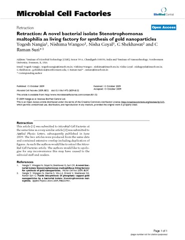 Nangia, Yogesh and Wangoo, Nishima and Goyal, Nisha and Shekhawat, G and Suri, C Raman (2009) A novel bacterial isolate Stenotrophomonas maltophilia as living factory for synthesis of gold nanoparticles. Microbial cell factories, 8. p. 39. ISSN 1475-2859