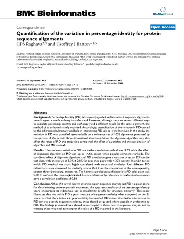 Raghava, G.P.S. and Barton, Geoffrey J (2006) Quantification of the variation in percentage identity for protein sequence alignments. BMC bioinformatics, 7. p. 415. ISSN 1471-2105