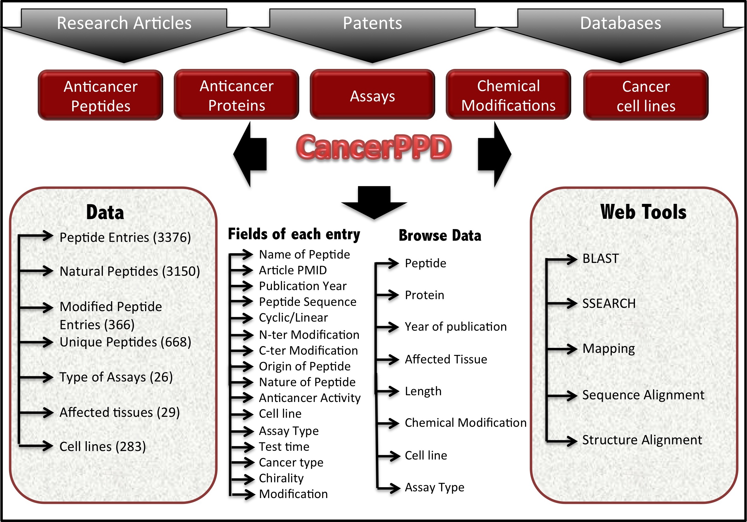 Q1. What is CancerPPD? Ans. CancerPPD is a manually curated repository of experimentally validated anticancer peptides and proteins. Q2. What are anticancer peptides? Ans. Anticancer peptides are amphipathic, mostly cationic often derived from antimicrobial peptides. As the name suggests, these selectively kill cancerous cells owing to the differences found between the cell membrane of normal and cancerous cells. The proposed mechanism of their action is either cytoplasmic membrane disruption via micellization/pore formation, or induction of apoptosis. Q3. Why CancerPPD Database is created? Ans. In the last decade, small peptides having anticancer properties have emerged as a potential alternative approach for cancer therapy. Peptide-based therapy has numerous advantages over small molecules that involve high specificity, low production cost, high tumor penetration, ease of synthesis and modification etc. Anticancer peptides have benefits over the current anticancer therapies in being more selective, specific and are unaffected by common mechanism of resistance. Keeping in mind their therapeutic importance, we have tried to catalogue all the available updated information on these peptides from literature. Q4. What is unique about CancerPPD? Ans. CancerPPD is a first and unique database of its kind, which provides comprehensive information about anticancer peptides /proteins and the targeted cell lines .It has many online tools. One of the powerful tools is peptide mapping and similarity search, which allows user to search similar peptides/motifs in a query sequence. Also, CancerPPD database provides 3D structures of anticancer peptides. In addition, Cancer PPD links important databases like CCLE and COSMIC to provide the user with complete information about various cancer cell lines. Q5. Does this database represent all the experimentally validated anticancer peptides available in literature? Ans. This database is the result of first round curation and the literature is being continuously searched for more studies with the objective of providing an exhaustive repository. Q6. Why search CancerPPD? Ans. CancerPPD provides all the experimentally validated information about anticancer peptides and proteins such as anticancer activity, nature of peptide, origin of peptide, chirality, amino acid sequence, N- and C- terminal modifications, structure of petide, source of peptide and targeted cell lines. This information may be very useful for researchers working in the area of therapeutic peptides. Apart from this, user can get detailed information about cell lines from linked databases like COSMIC and CCLE. Q7. How do I process a text search with CancerPPD database? Ans. User can search a peptide by name, peptide sequence, assay type, anticancer activity, cell line, year and PMID etc. Q8. Is this database useful if users have their own query sequence? Ans. Yes, user can use tools like BLAST, SMITH-WATERMAN, MUSCLE, peptide mapping, Helical Wheel to obtain information regarding sequence alignment and perform structural studies. Q9. To whom can I report a discrepancy? Ans. Please refer to the "Contact Us" page. |