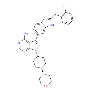 | Smiles | c1(ncnc2c1c(nn2[C@H]1CC[C@@H](CC1)N1CCOCC1)c1cc2c(cc1)nc([nH]2)Cc1ccccc1Cl)N |