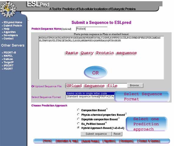 | Stepwise Help:- Name of Protein-: This is an optional field.The name of protein may have letters and number with the "-" or "_". All other character are non-permissible.The field is assigned a default name "Protein". The sequence name is just used for only your information. It may be a problem with ?, ?, ? for example or an empty space within the name of the sequence, which is not allowed for reasons of security. Protein sequence-:This server allows the submission of sequence in any of the standard formats. The user can paste plain sequence in the provided inbox.The server also has the facility for uploading the local sequence files. Amino acid sequences must be entered in the one-letter code.All the non standard characters will be ignored from the sequence. Sequence Format:-The server can accept both the formatted or unformatted raw antigenic sequences.The server uses ReadSeq routine to parse the input.The user should choose wether the sequence uploaded or pasted is plain or formatted before running prediction.The results of the prediction will be wrong if the format choosen is wrong. Prediction Approach:-The method allow the prediction on the basis of five different appraoches. These approaches along with the reliability to predict the subcellulat localization of proteins.The prediction is based on