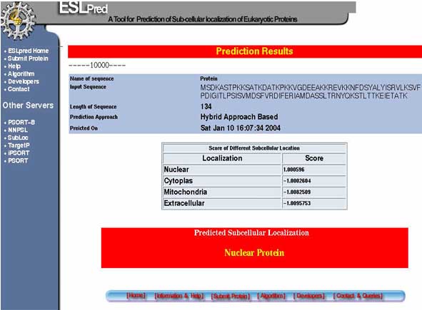 Prediction Results:-After the analysis the result having the sequence of protein, length of protein, score of protein for each subcellular localization is illustrated. The results also depict the final predicted sub-cellular localization of protein.A sample of results page is shown below.