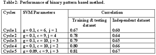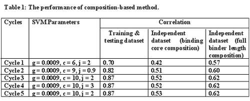Evaluation of the performance: In this study five fold cross validation was used to evaluate the performance of the method. The original dataset was divided randomly into five sets. All of the sets consisted of nearly equal number of peptides. Four sets were used for training and the remaining one for the testing of the methods and this procedure was repeated five times so that each set is used at least once for training as well as for testing.The correlation between the actual and predicted affinity was then calculated by the formula: