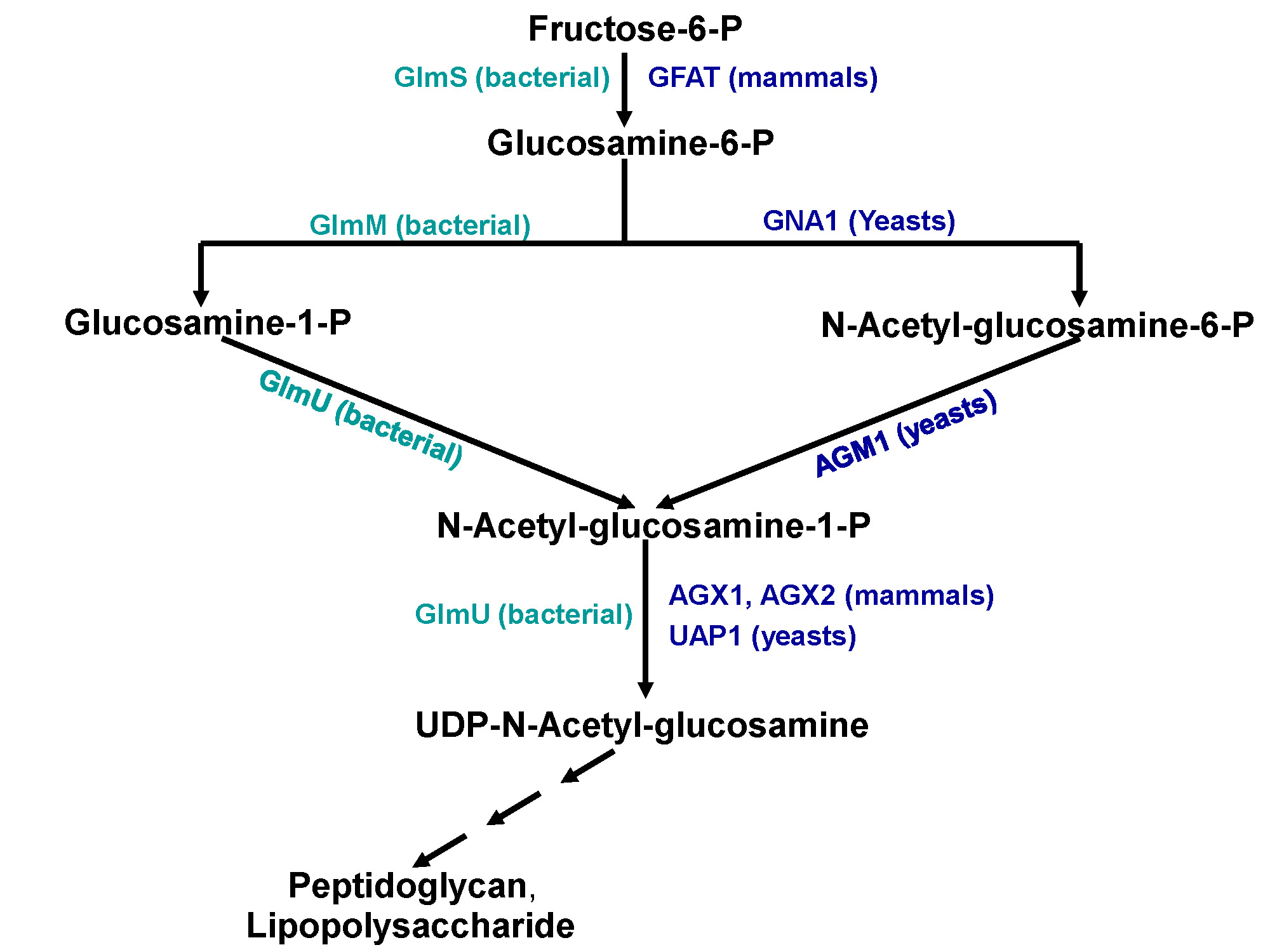 ![]() Figure shows the importance of Glmu protein in cell wall synthesis pathway. Left side shows ezymes presents in prokaryotes and right side shows enzyme in eukaryotes. |