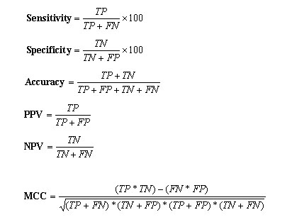 The prediction model are fine tuned by changing the parameter C , which control the training error and the margin. The performance of the different models was measured by checking on the testing set. The model having minimum error and maximum correlation coefficient on test set is considered the best model. This best model was further applied on the blind dataset that is unseen by the prediction model. Evaluation of Method Performance: -The five set cross-validation has been used to develop and evaluate the performance of the prediction methods. In five set cross-validation, five subsets of data has been constructed randomly from the dataset. The datasets for SVM, WEKA and PEBLS consist of training and testing set. The training set is consists of four subsets and the testing is done on the remaining fifth set. This process is reapted five times so that each subset can be can be used for testing and training. In this way the five models were generated in the five set cross-validation. The final prediction results have been averaged over the five testing sets.Performence Measures:Six parameters have been used in present work to measure the performance of 20S proteaosme prediction method as described by Kesmir et al., 2002. These five parameters were derived from four scalar quantities: TP (number of correctly identified cleavage sites), TN (number of correctly identified non-cleavage sites), FP (experimentally verified non-cleavage sites, predicted as cleavage sites) and FN (experimentally verified cleavage sites predicted as non-cleavage sites). The parameters derived from these values are as follows i) sensitivity, is the percentage of correctly identified cleavage sites; ii) specificity, is the percentage of correctly identified non-cleavage sites; iii) PPV and NPV are positive and negative prediction value respectively; iv) accuracy, is the percentage of correctly identified cleavage and non-cleavage sites. v) Matthew's Correlation coefficient (MCC), is more stringent measure of prediction accuracy accounts for both under and over-predictions. These parameters are calculated by using the following equations: