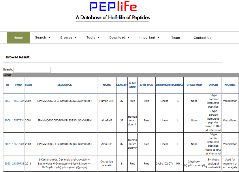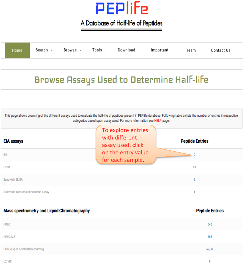 This interface allows users to browse entries with different assay used to test half-life of the peptides.