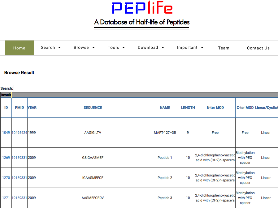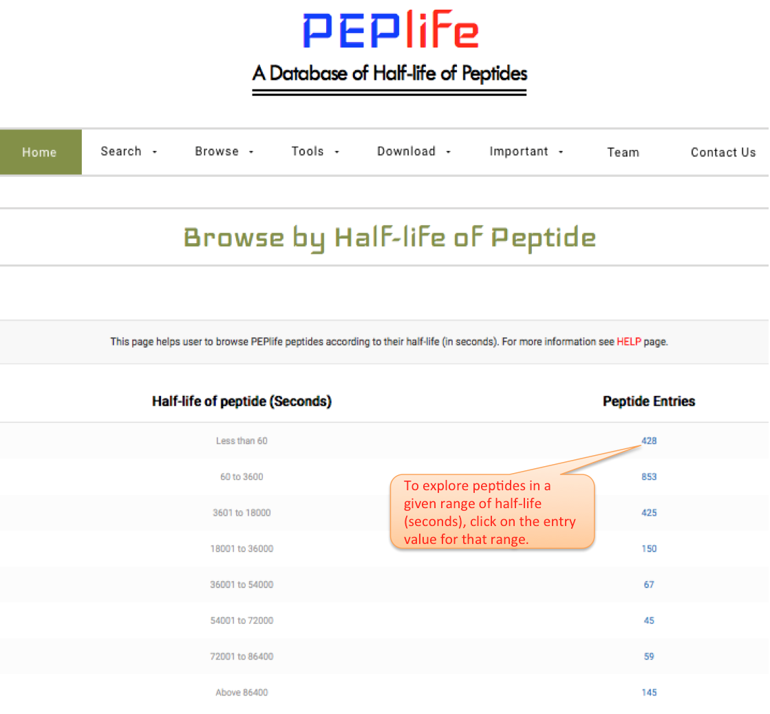 This interface allows users to browse entries of peptides by their half-life converted in seconds.